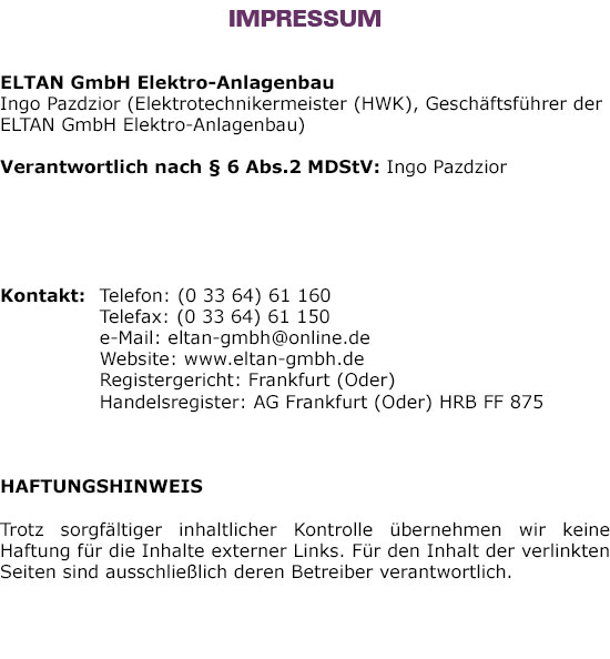 Telefon Büro: (0 33 64) 61 160, Fax: (0 33 64) 61 150, E-Mail: eltan-gmbh@online.de, Am Kanal 25, 15890 Eisenhüttenstadt |